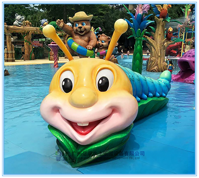 水上樂園設備戲水小品大青蟲滑梯整體設計前端,制作精良、線條流暢、色彩鮮艷、栩栩如生。它設計得就跟“花千骨”里的糖寶一樣。頭上兩只觸角,笑呵呵的還露出兩顆兔子牙。特別卡通,特別可愛。加上噴水效果讓孩童仿佛置身于童話世界。特別適合水上樂園設備親子戲水樂園水上滑梯的一款輔助設備。廣州碧潮提供設計生產(chǎn)施工一體化打造。