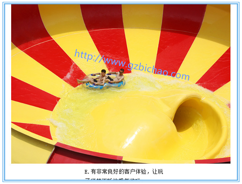 水上樂園設(shè)備、水上游樂設(shè)備超級巨獸碗滑梯又稱旋渦滑梯,占地2000多平方米,游客乘坐皮筏從13.5米高的平臺口滑下,通過一段長達(dá)幾十米的全封閉的管狀滑道之后,會高速沖入一個直徑 15米的巨碗,在離心力的帶動下,游客好像在太空中旋轉(zhuǎn)一樣,讓人目眩神迷,最后被吸入碗中間的洞口,游客會享受到難忘的滑行體驗,尖叫聲將伴隨滑梯的始終。該水滑梯深受青年人的喜愛,既刺激又好玩。